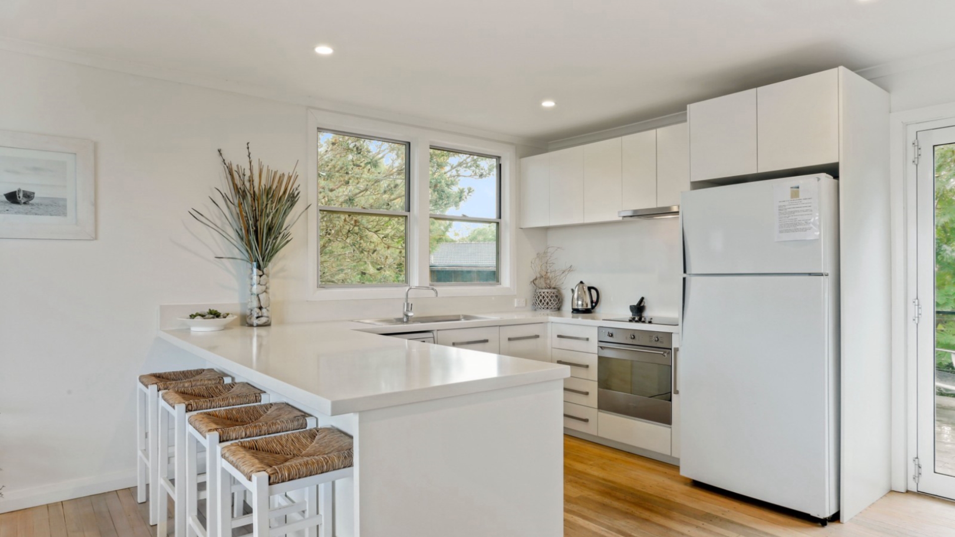 Modern well appointed kitchen with stone benchtops, dishwasher and stainless steel appliances