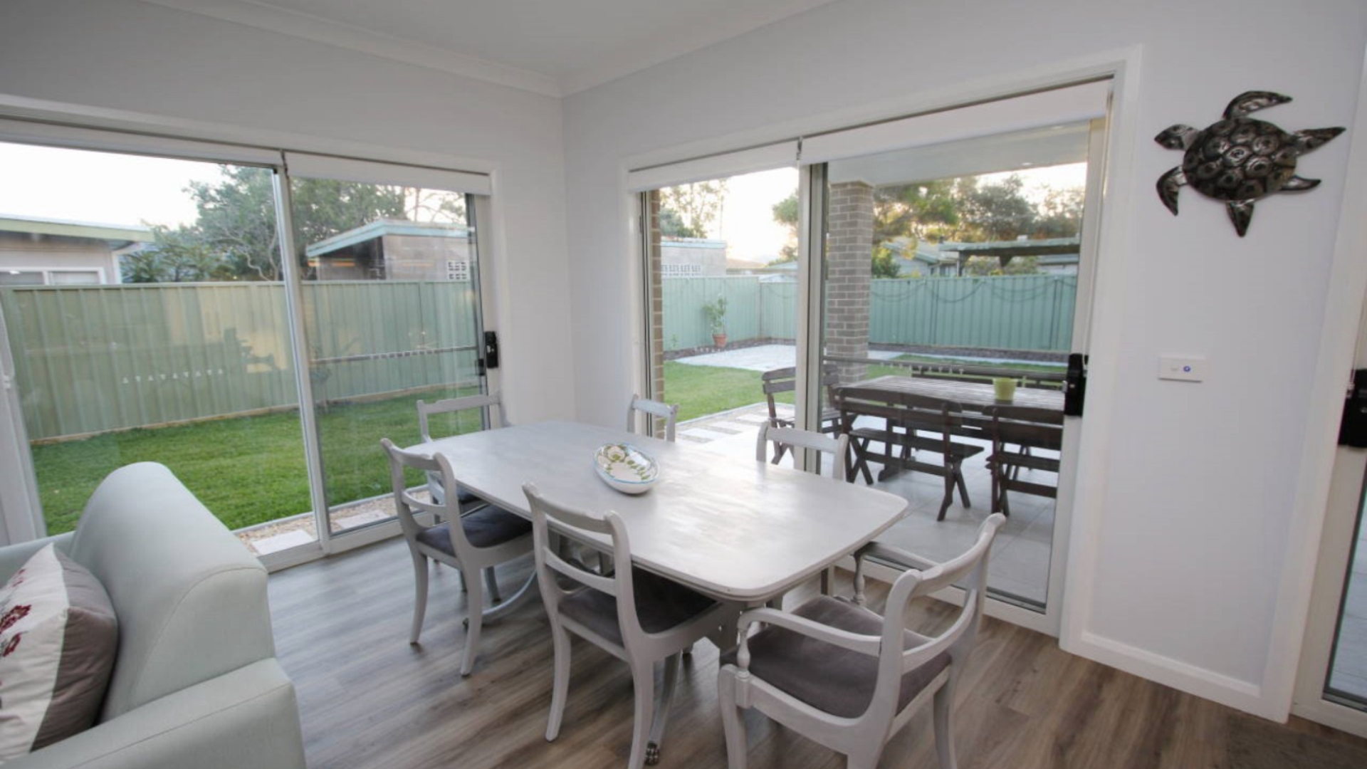 Lovely 4 bedroom 2 bathroom luxury home only minutes from Hawks Nest golf club, shops, restaurants, river and beach. Beautifully furnished throughout - features include big screen TV, comfortable sofas, dining for 6-8, second family room with TV upstairs, main bedroom with ensuite, quality kitchen appliances, washer and dryer, large outdoor area with outdoor setting and barbecue, fully fenced secure yard, this property has ducted airconditioning throughout Sleeps 8 (2 queens, 2 singles and 1 set of single bunk beds) This property has WIFI - Linen is not supplied but can be hired from us and the cost is $22 per person.