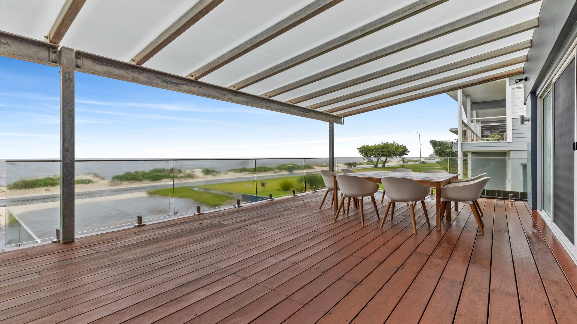 Two large 3 seater lounges looking straight out onto Jimmys Beach