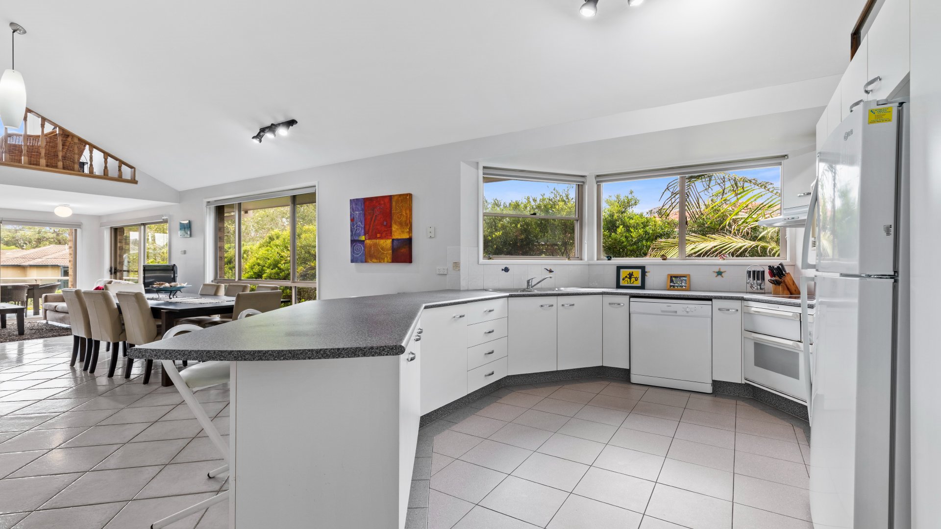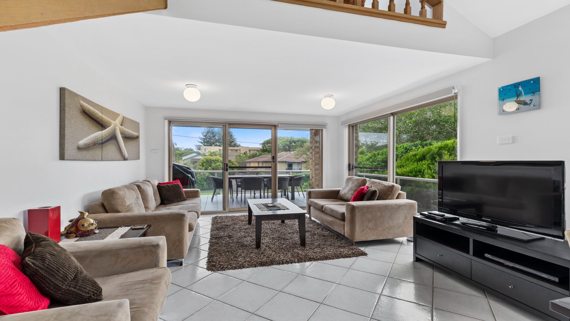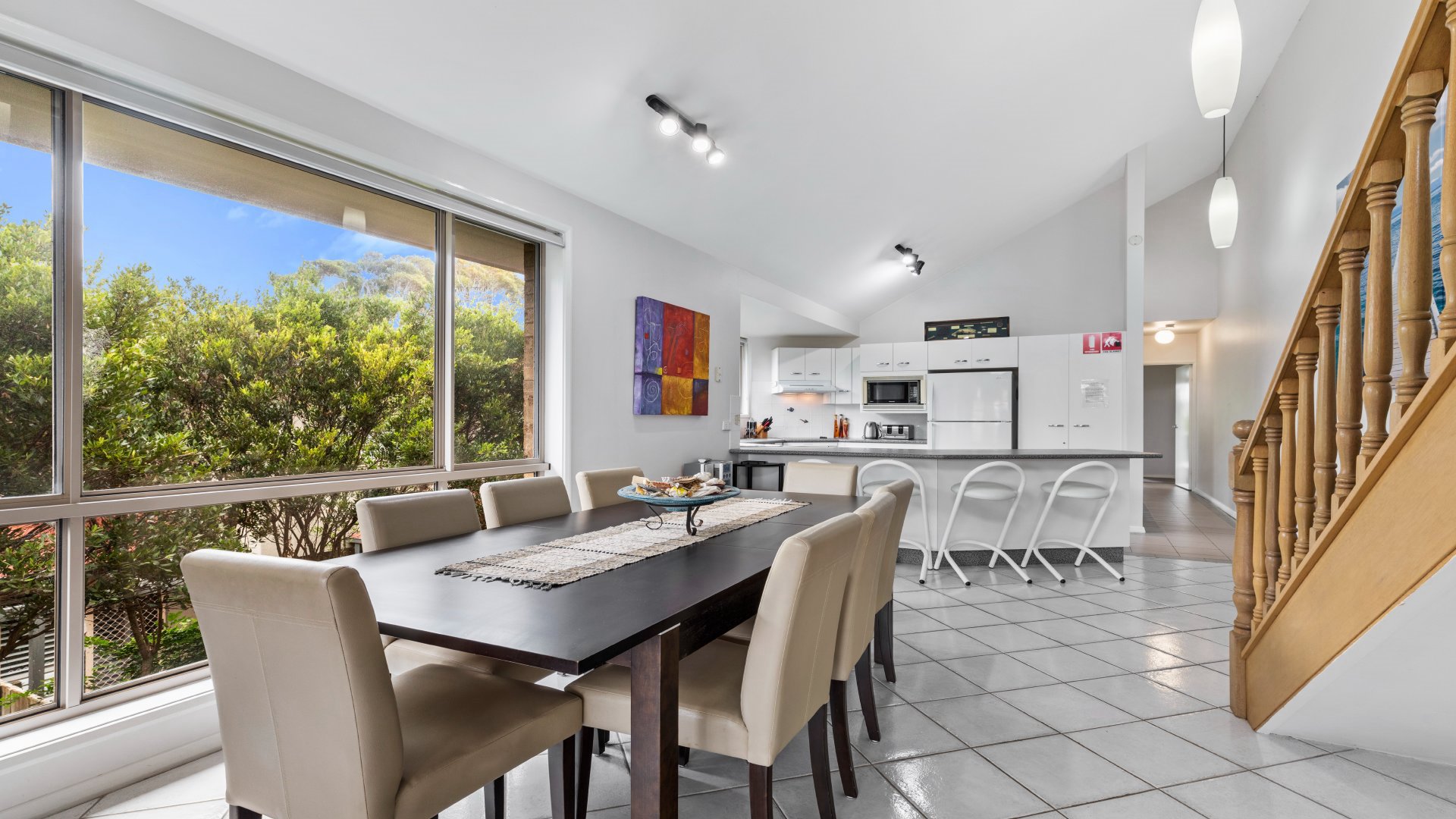 Three bedrooms, two bathrooms, and loft with a second living area, there is plenty of space for family, friends and pets. Off-street carpark, private, fenced yard. Just a short walk (or bike ride) away from some of the area's best attractions, including surf beach (200m), Jimmys Beach (800m), The Benchmark Hotel (100m), cafes (500m), golf club (700m), and shops (500m). The living area opens onto a covered deck, with BBQ, which is perfect for outdoor entertaining and taking in the beautiful surroundings. A laundry has washing machine and dryer. Bikes and some water sport equipment supplied.